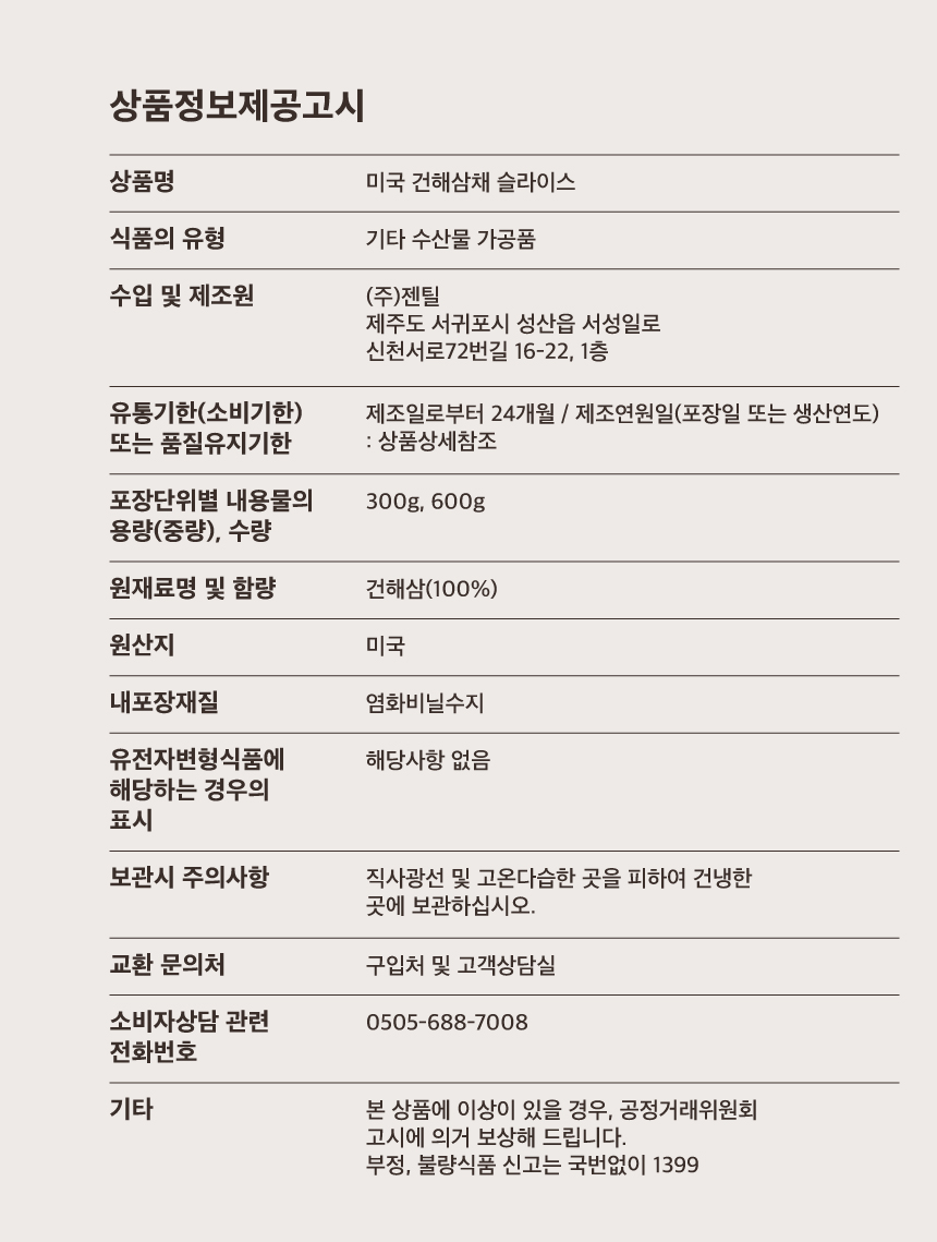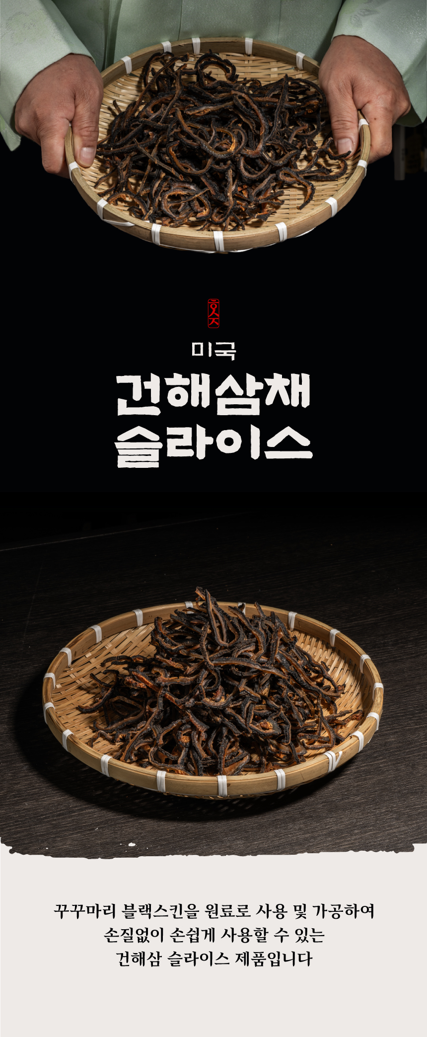꾸꾸마리 블랙스킨을 원료로 사용 및 가공하여, 손질없이 손쉽게 사용할 수 있는 건해삼 슬라이스 제품입니다.