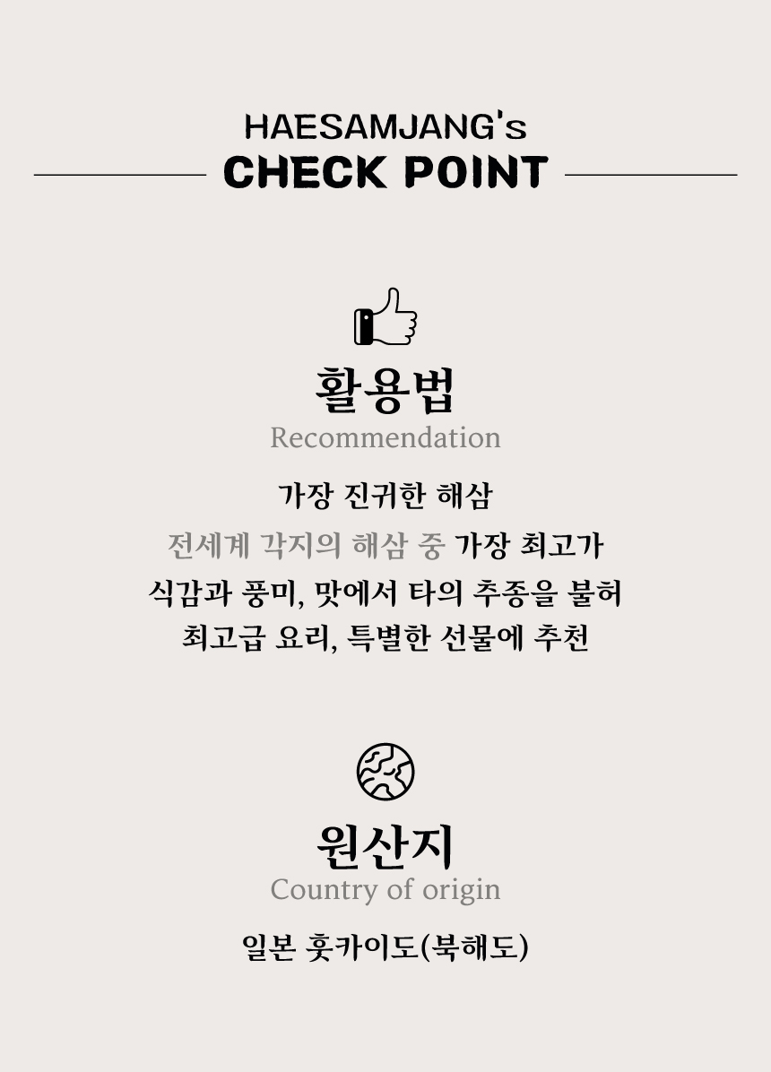 일본 북해도(훗카이도) 산의 건해삼으로, 해삼 중 가장 진귀한 최고급 건해삼입니다.