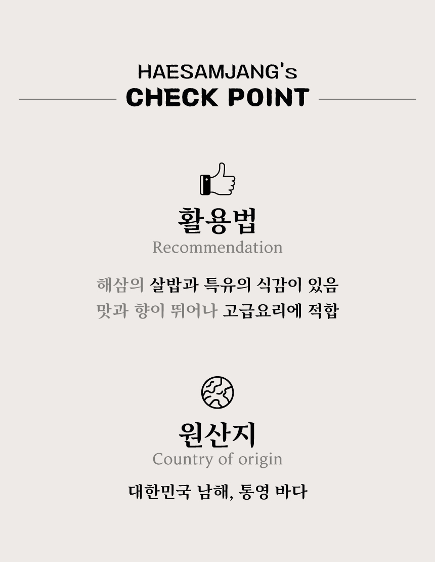 해삼이 가진 식감이 좋으며, 특히 맛과 향이 뛰어나 고급요리에 적합합니다.
