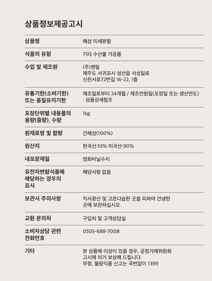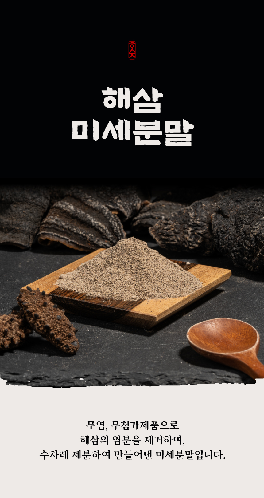 무염, 무첨가제품으로 해삼의 염분을 제거하여, 수차례 제분하여 만들어낸 미세분말입니다.