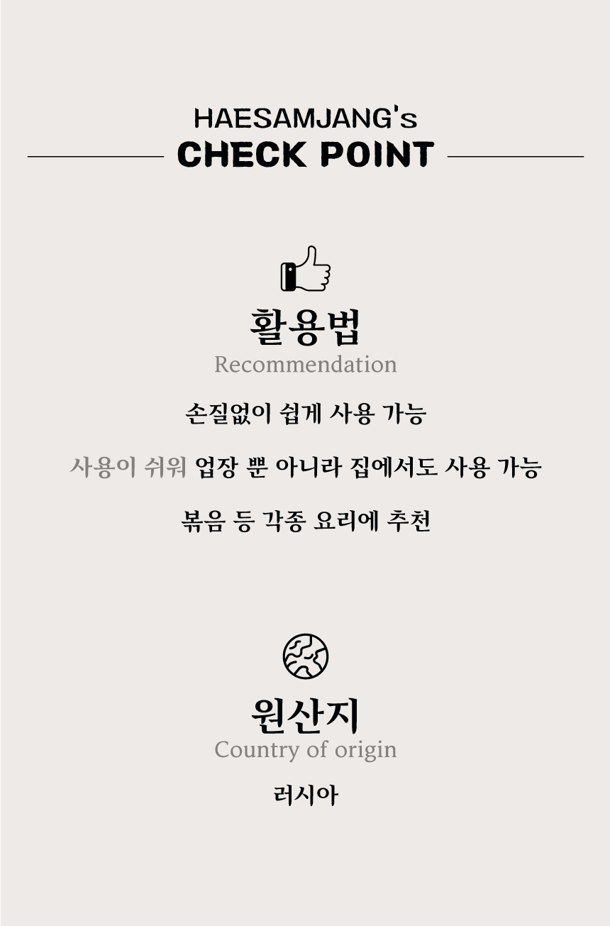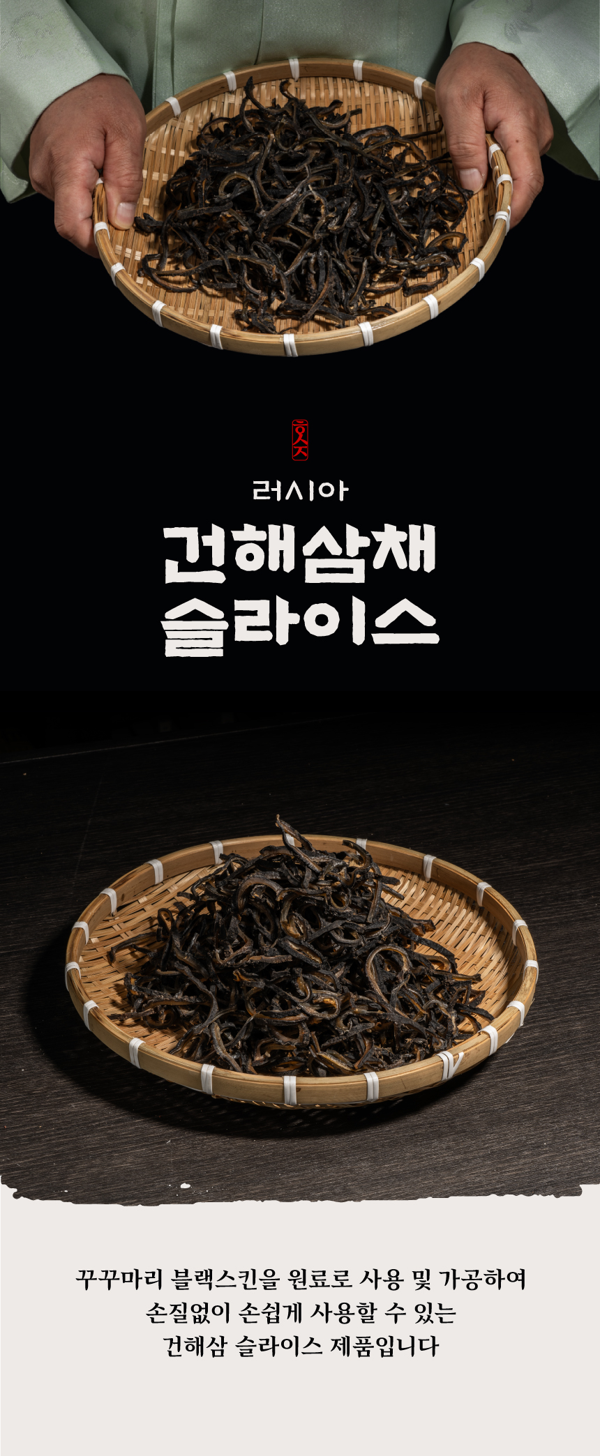 꾸꾸마리 블랙스킨을 원료로 사용 및 가공하여, 손질없이 손쉽게 사용할 수 있는 건해삼 슬라이스 제품입니다.